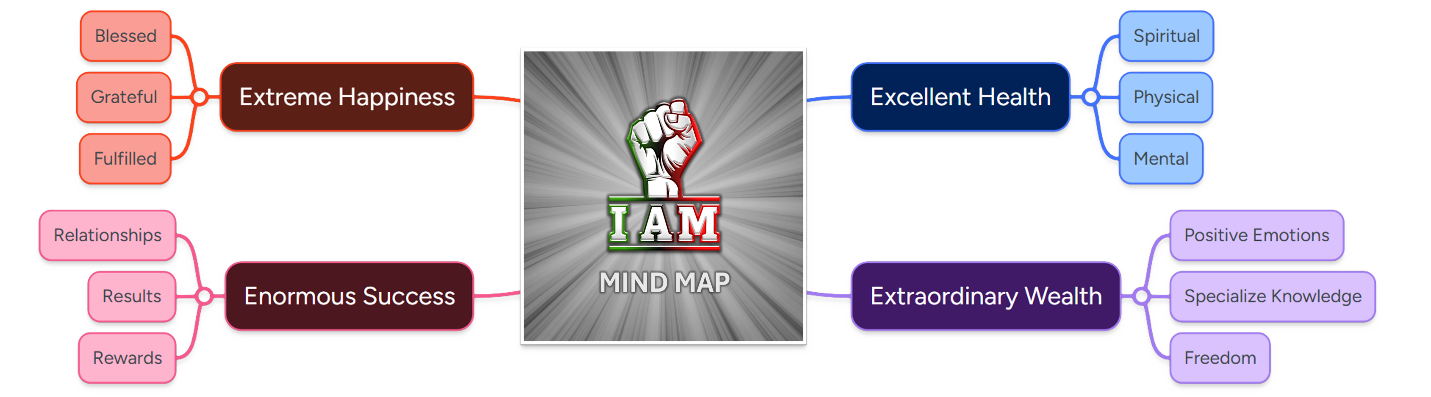 The I AM System is the first step of your Mappineering Journey guiding you to create your personal I AM Mind Map and anchor your vision around four core areas: